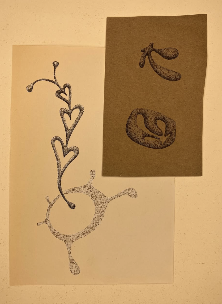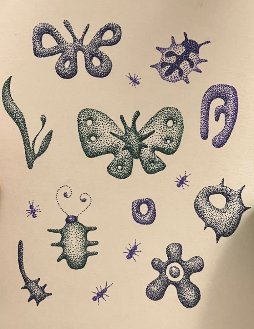 Hi! My name is Chloe (they/them). I specialize in handpoked tattoos and have been tattooing for the past 4 years professionally along with a few prior years tattoing myself and my lovely friends unprofessionally. I love dancing, skating, spending time outside, watching shadows move, and screaming. Sometimes my dog comes to the studio with me~